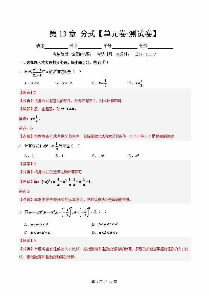 首页 > 全部 > 单元AB卷 > 第13章:分式【单元卷·测试卷】(沪教版2024)(解析版)