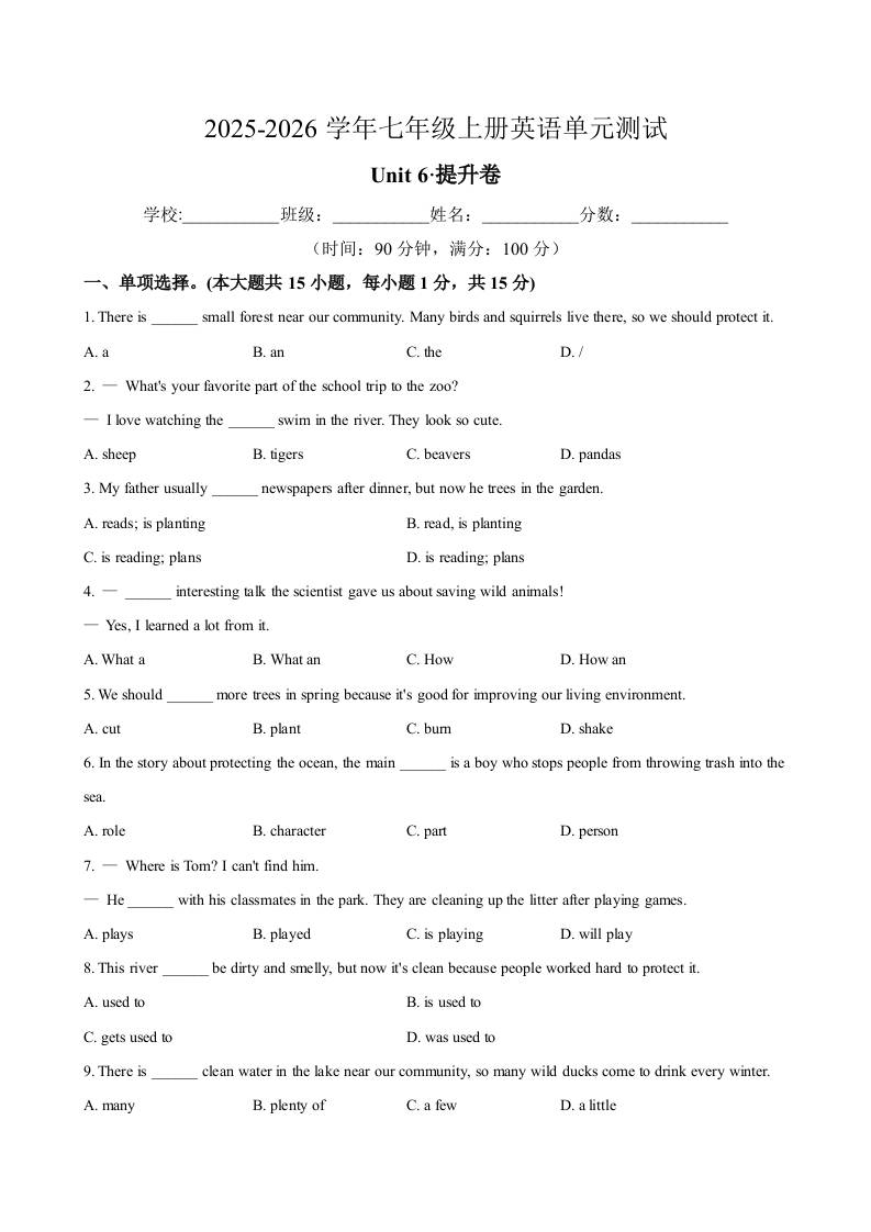 首页 > 全部 > 单元测试 > 七年级英语上册Unit6单元测试·提升卷(考试版A4)