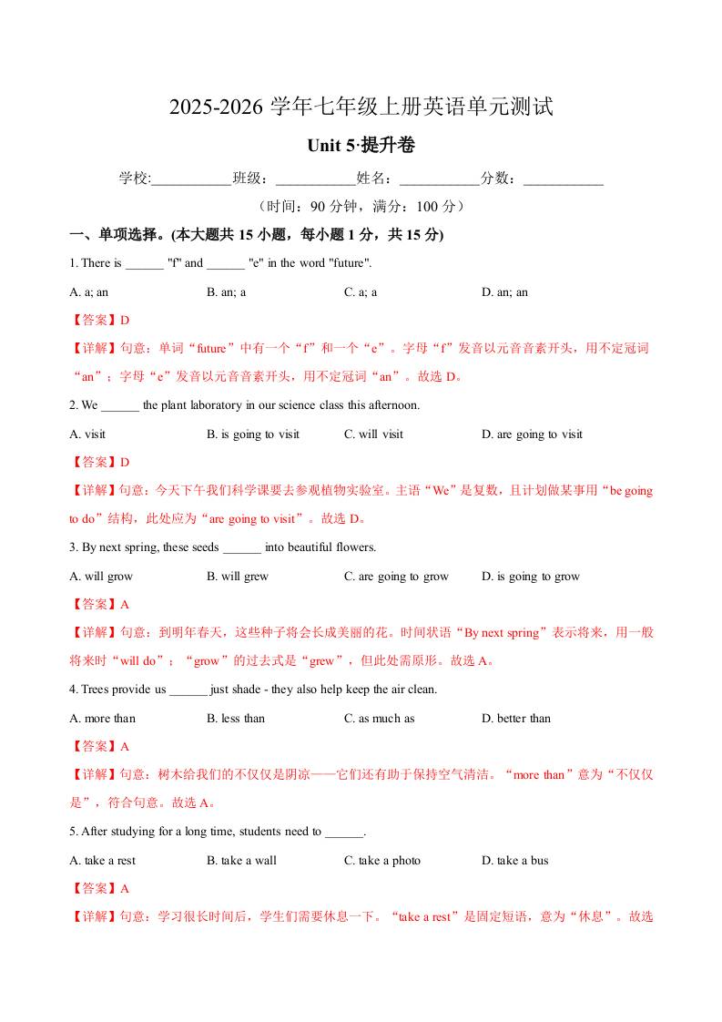 首页 > 全部 > 单元测试 > 七年级英语上册Unit5单元测试·提升卷(解析版)2