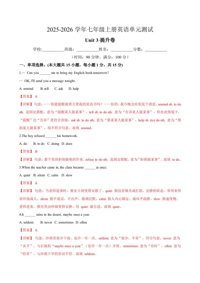 首页 > 全部 > 单元测试 > 七年级英语上册Unit 3单元测试·提升卷(教师版)