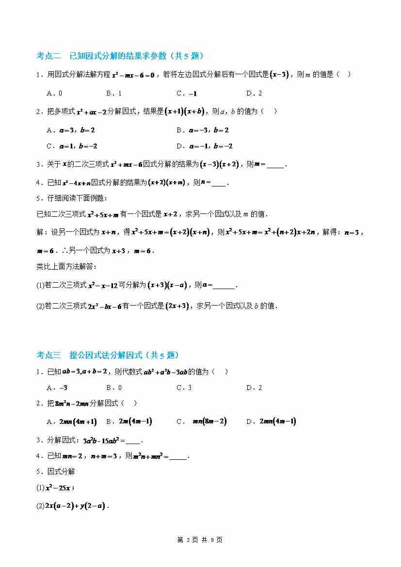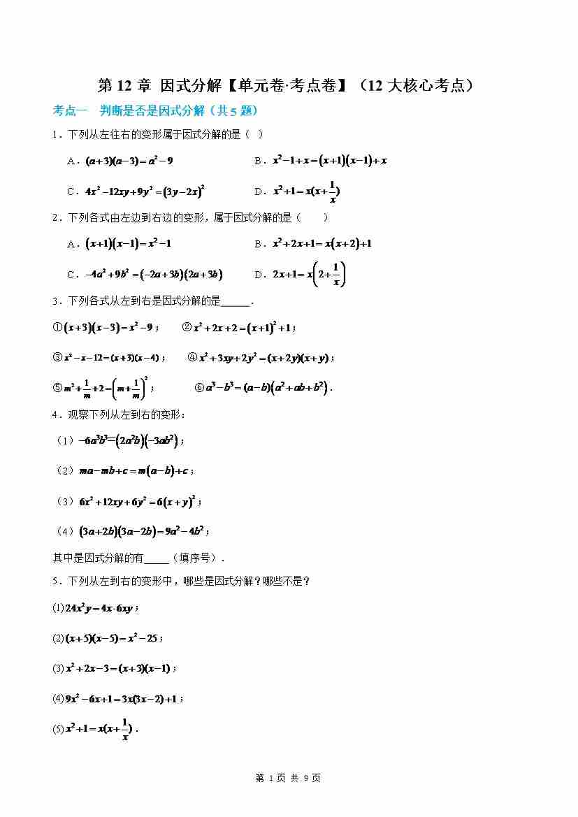 首页 > 全部 > 单元AB卷 > 第12章:因式分解【单元卷·考点卷】(沪教版2024)(原卷版)