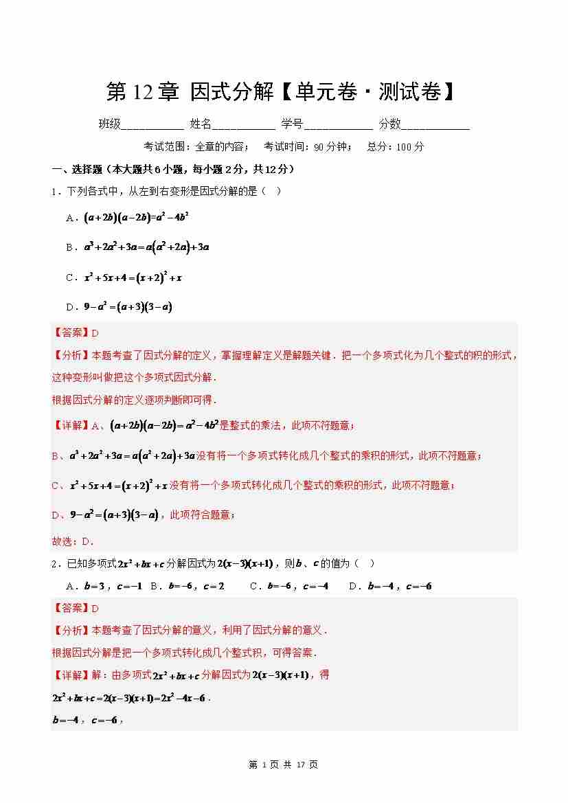 首页 > 全部 > 单元AB卷 > 第12章:因式分解【单元卷·测试卷】(沪教版2024)(解析版)