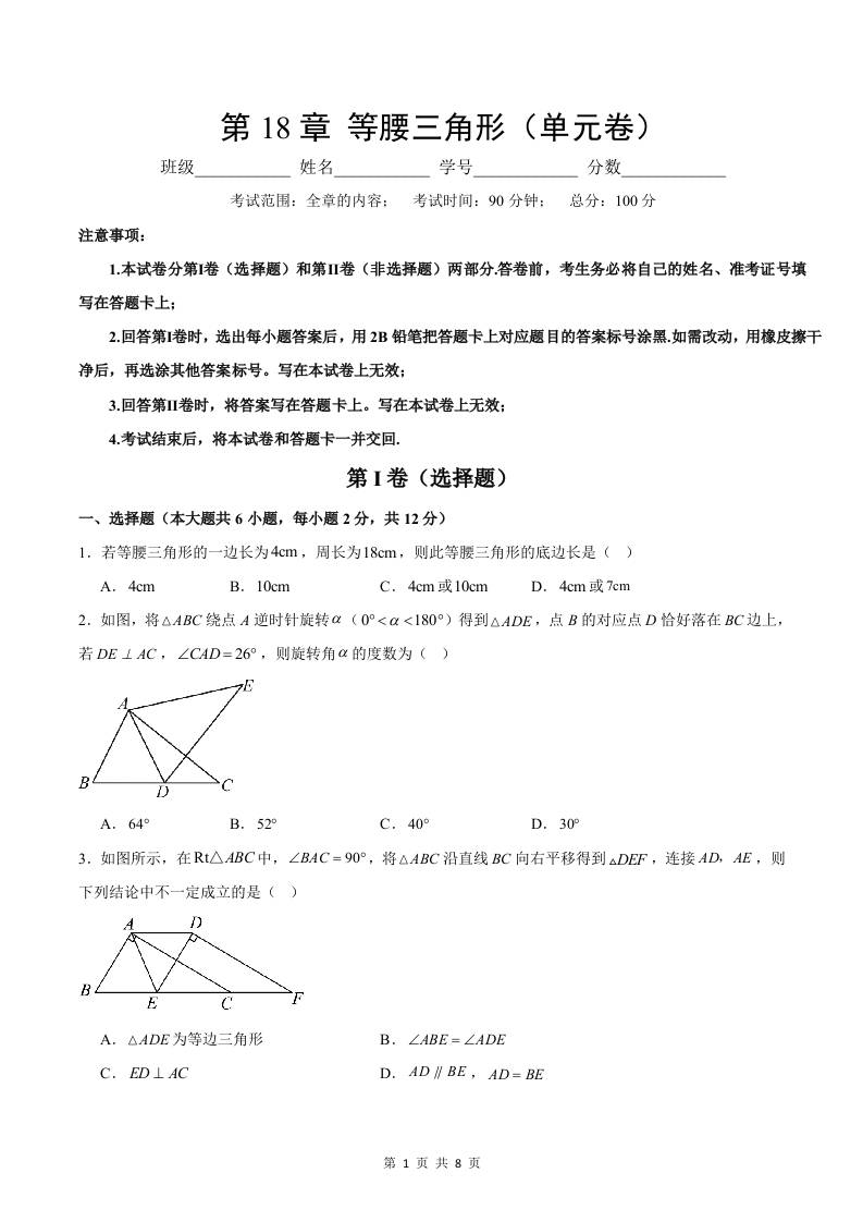 首页 > 全部 > 单元速记 > 第18章 等腰三角形【单元卷·测试卷】(原卷版)
