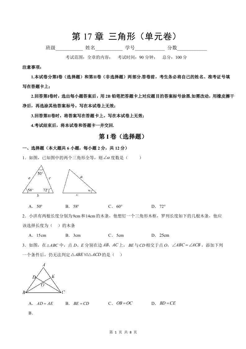 第17章 三角形【单元卷·测试卷】(原卷版)