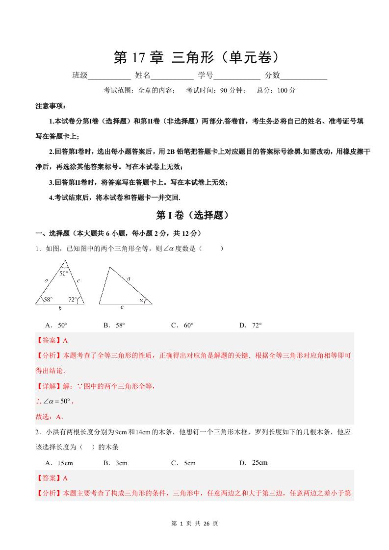 首页 > 全部 > 单元速记 > 第17章 三角形【单元卷·测试卷】(解析版)