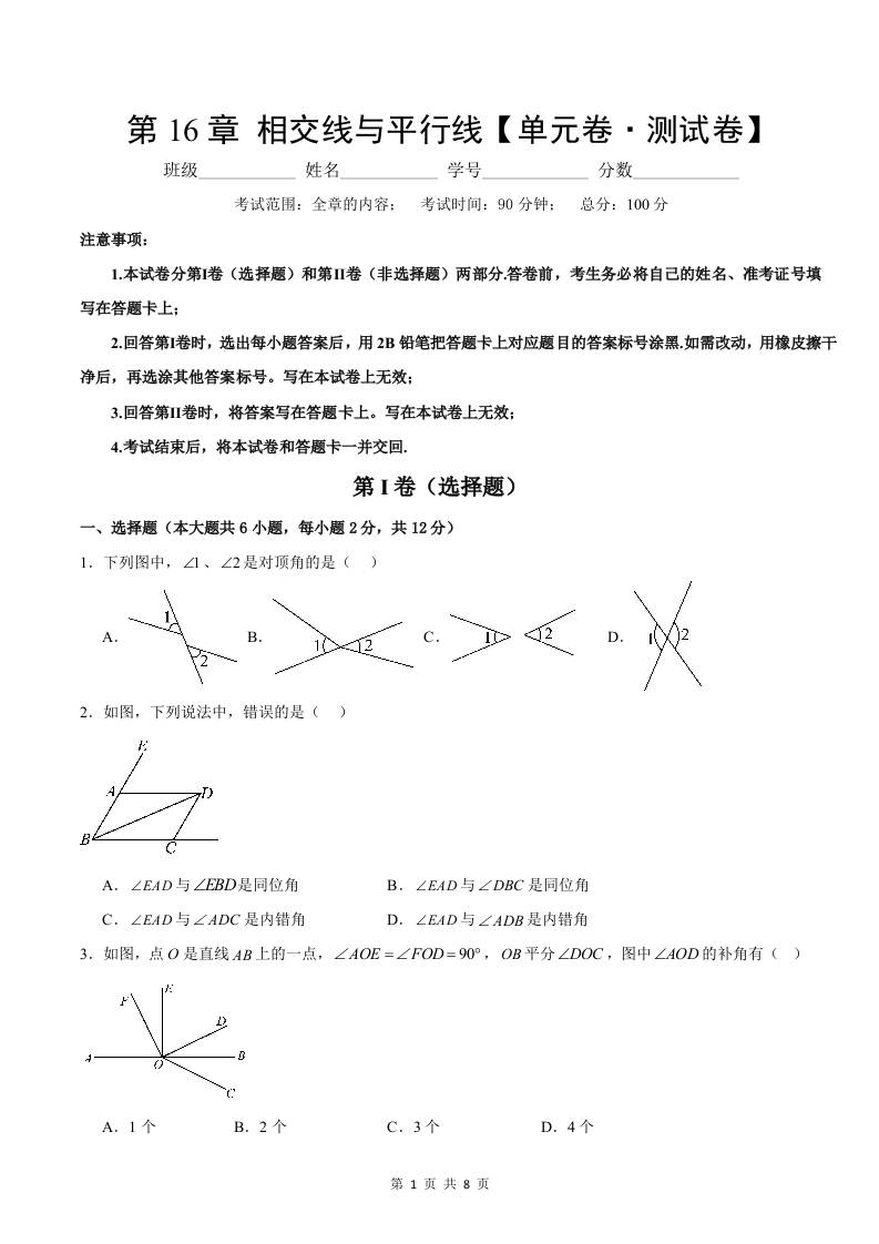首页 > 全部 > 单元速记 > 第16章 相交线与平行线【单元卷·测试卷】(原卷版)