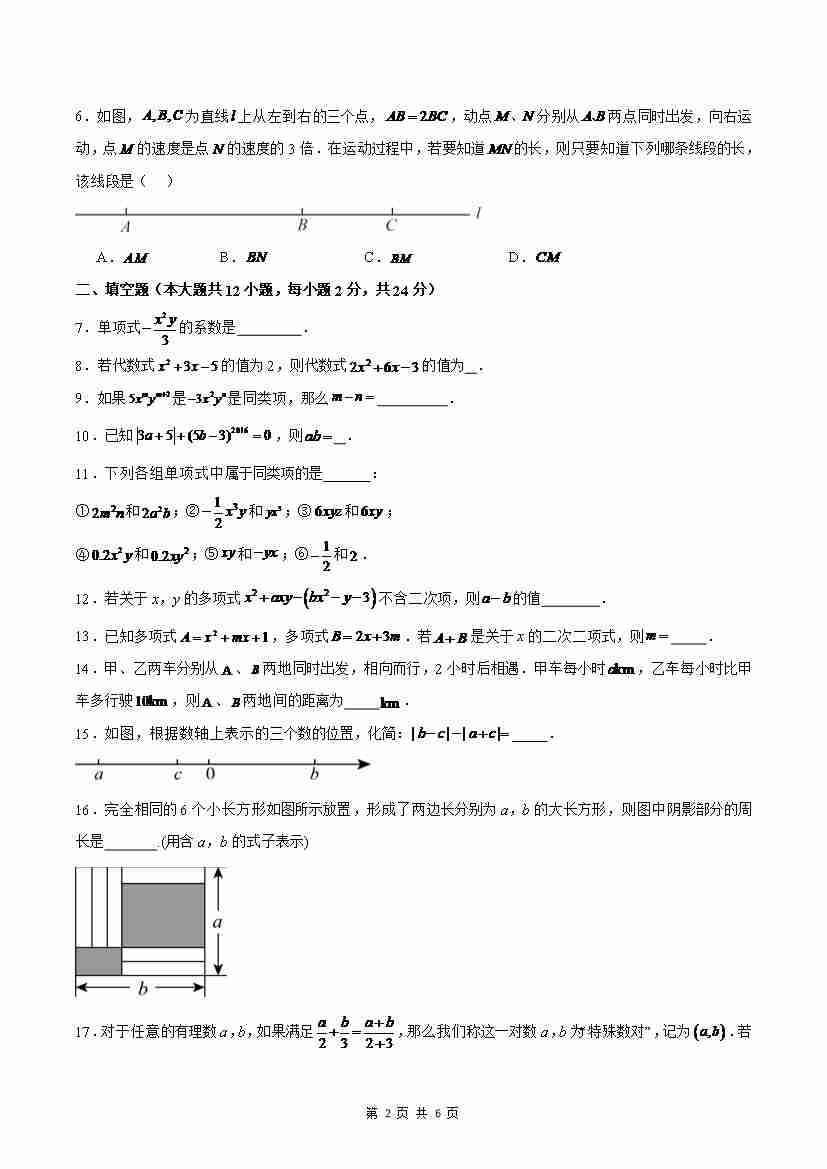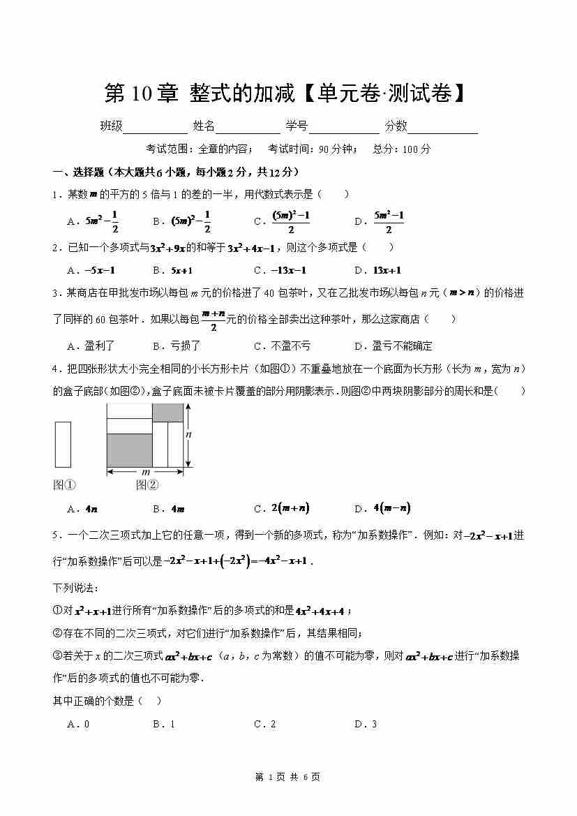首页 > 全部 > 单元AB卷 > 第10章:整式的加减【单元卷·测试卷】(沪教版2024)(原卷版)