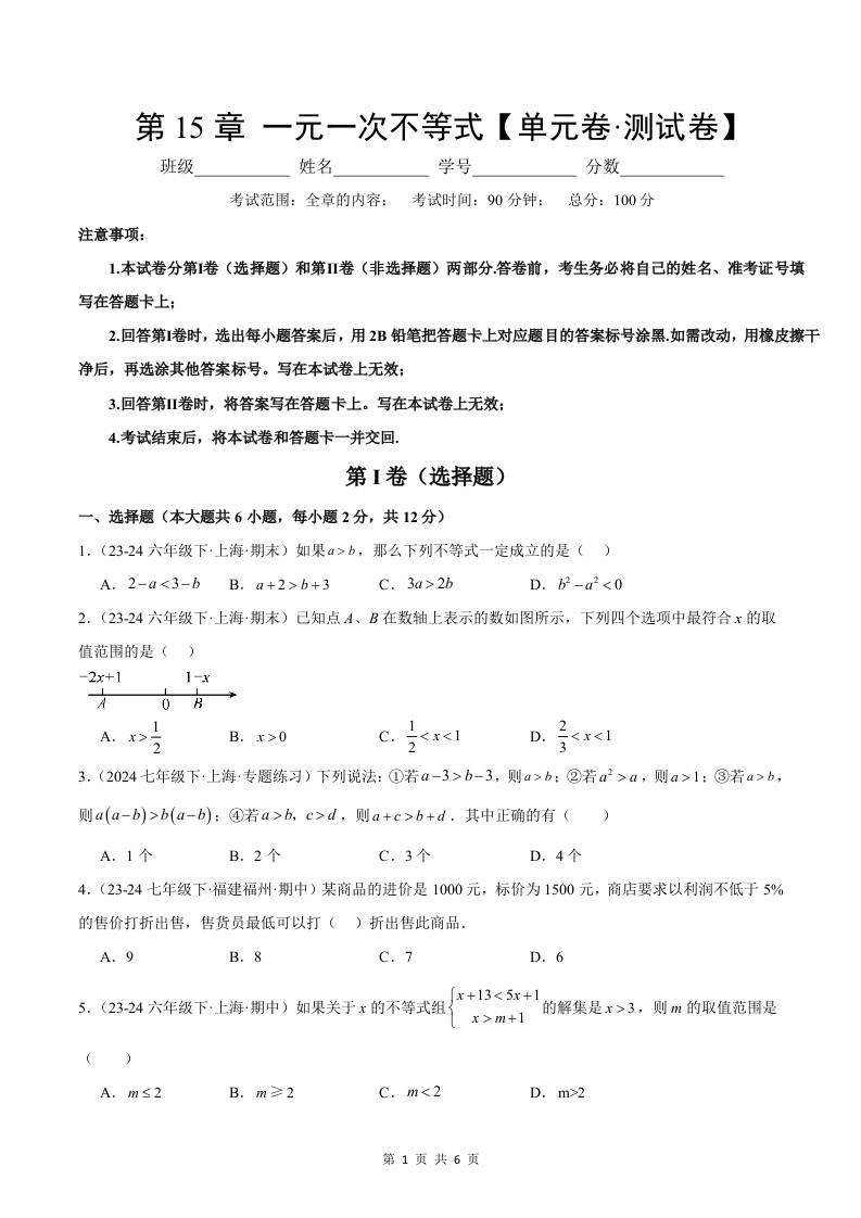 首页 > 全部 > 单元速记 > 第15章 一元一次不等式【单元卷·测试卷】(原卷版)