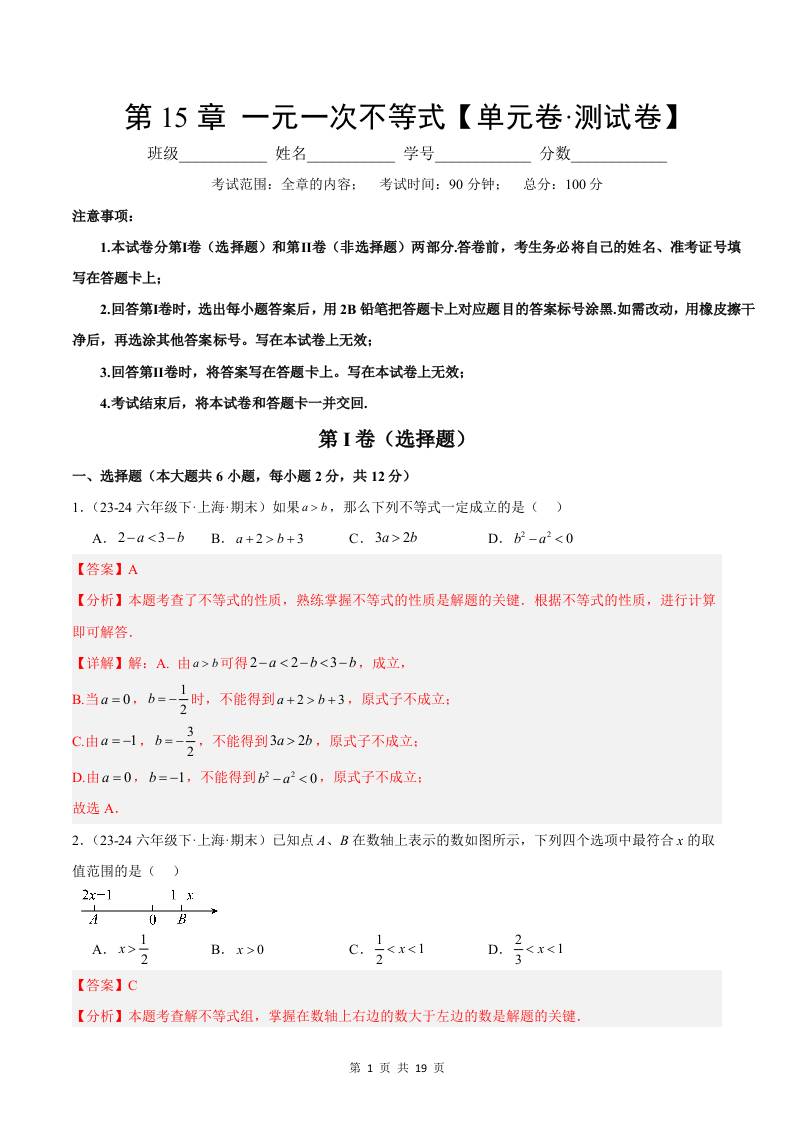 首页 > 全部 > 单元速记 > 第15章 一元一次不等式【单元卷·测试卷】(解析版)