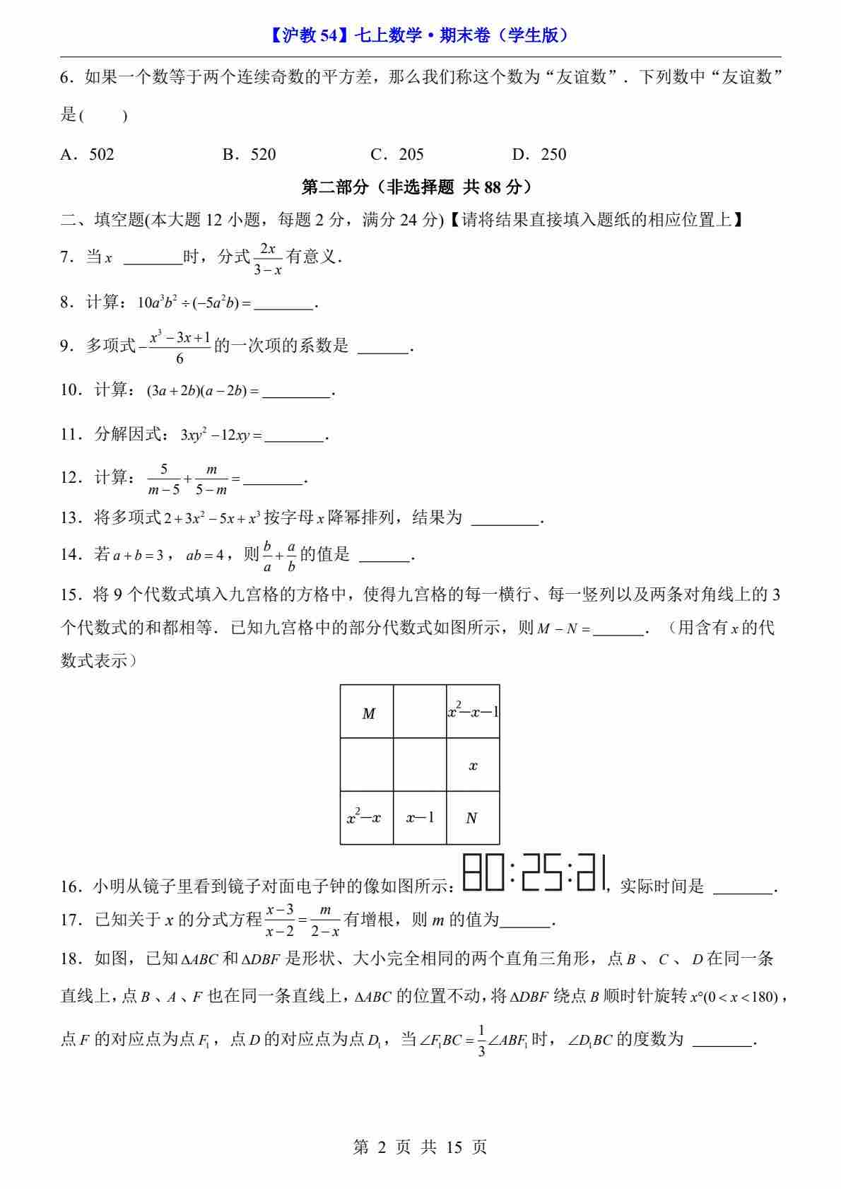 【沪教54】7上数学期末卷【7上全册】