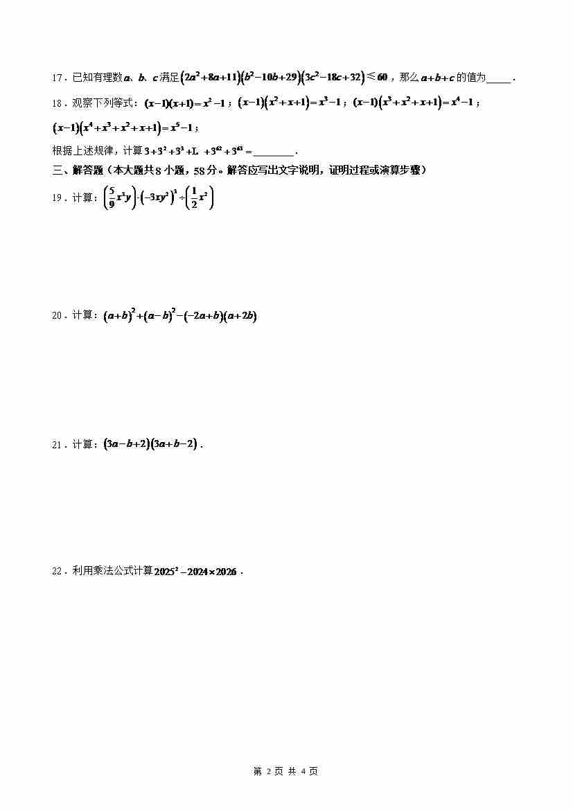 首页 > 全部 > 暑假讲义 > 【沪教】第11章:整式的乘除(单元测试)(原卷版)