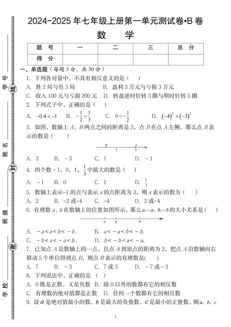 首页 > 全部 > 各平台作品 > 七上数学2024-2025年第一单元测试卷•B卷
