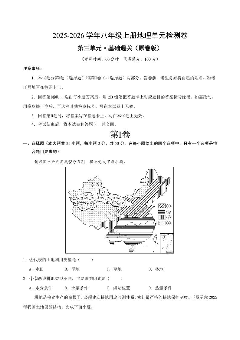 首页 > 全部 > 单元基础卷 > 八上地理 第三章测试·基础卷(考试版A4)