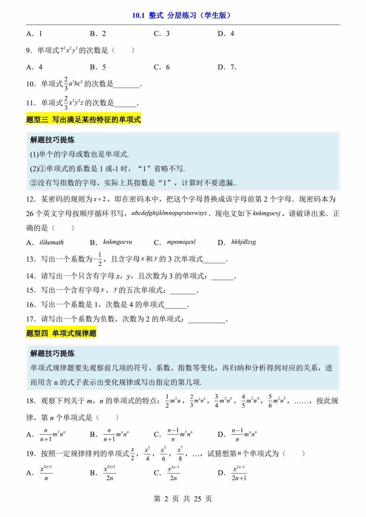 首页 > 全部 > 一课一练 > 10.1 整式(分层练习)