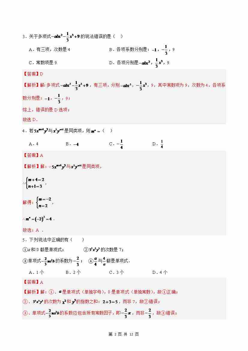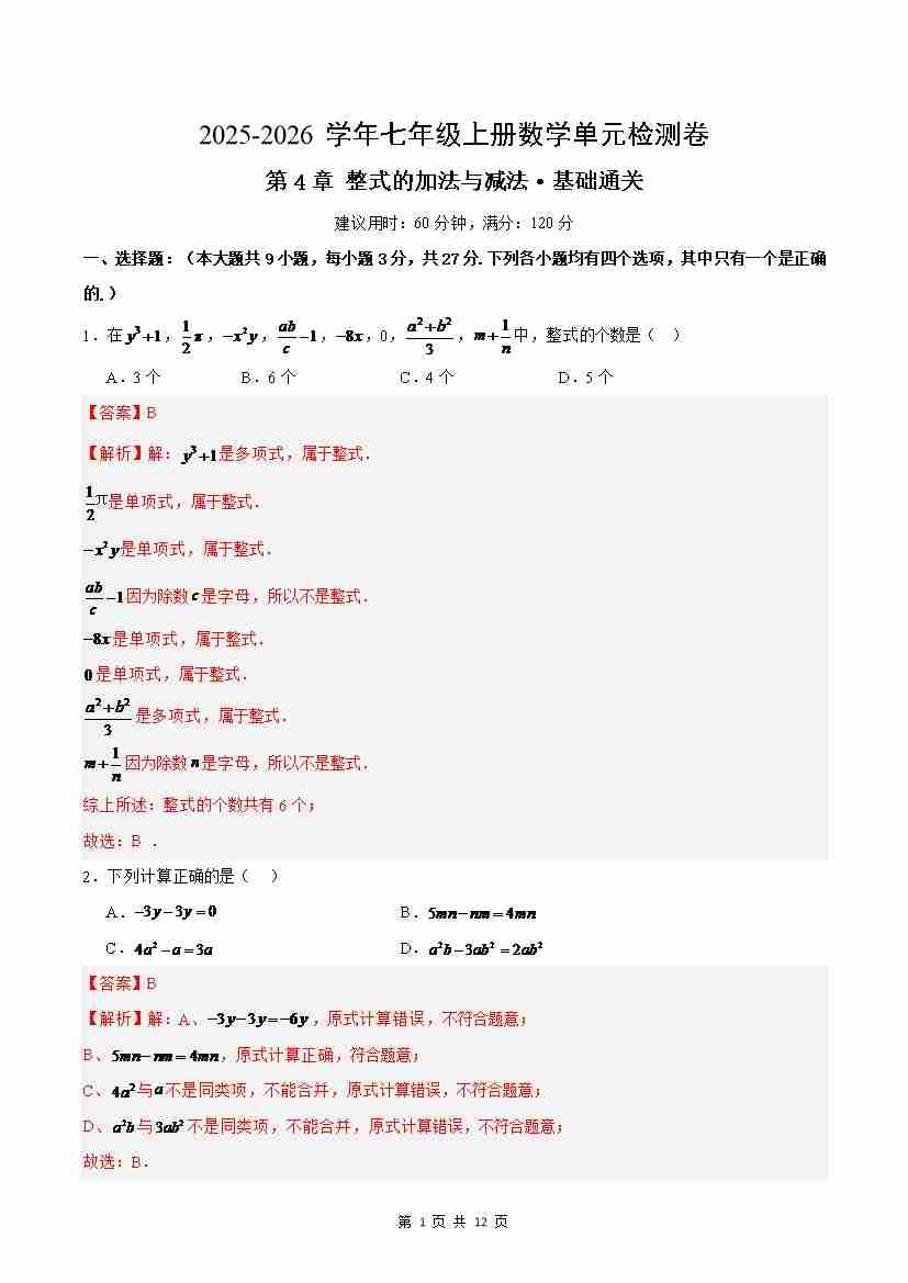 首页 > 全部 > 单元测试 > 七上数学第4章 整式的加法与减法测试·基础卷(解析版)