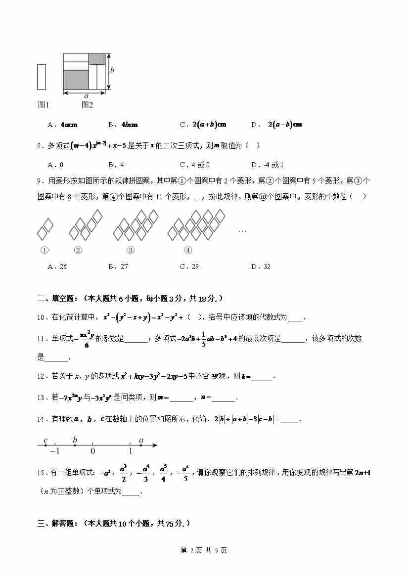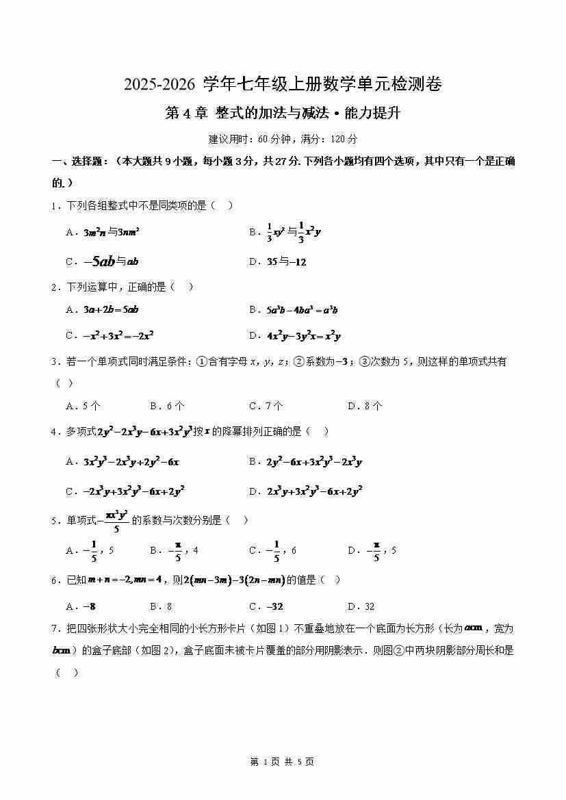 首页 > 全部 > 单元测试 > 七上数学第4章 整式的加法与减法测试·提升卷(考试版A4)