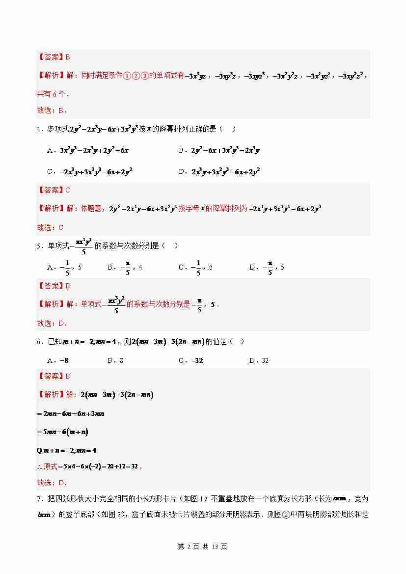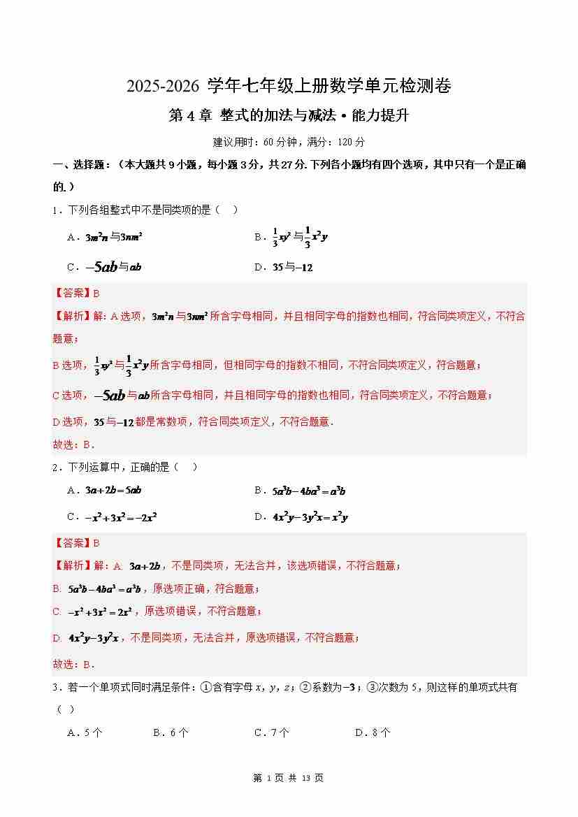 首页 > 全部 > 单元测试 > 七上数学第4章 整式的加法与减法测试·提升卷(解析版)