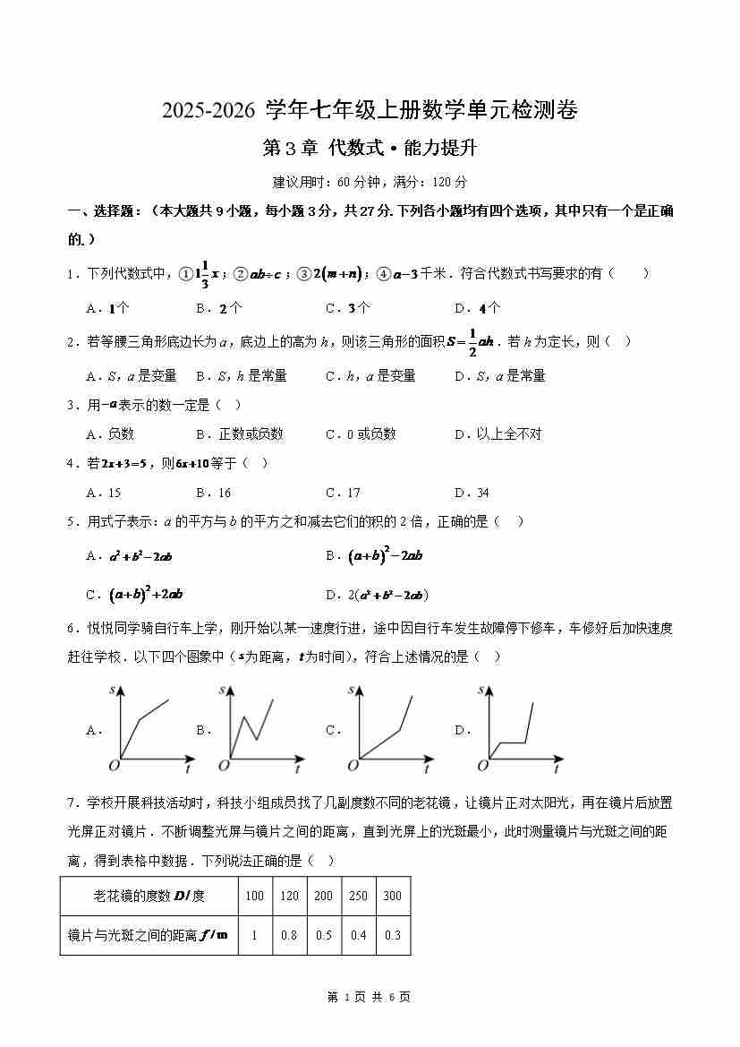 首页 > 全部 > 单元测试 > 七上数学第3章 代数式测试·提升卷(考试版A4)