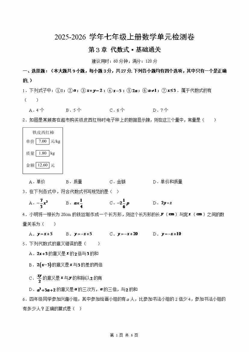 七上数学第3章 代数式测试·基础卷(考试版A4)