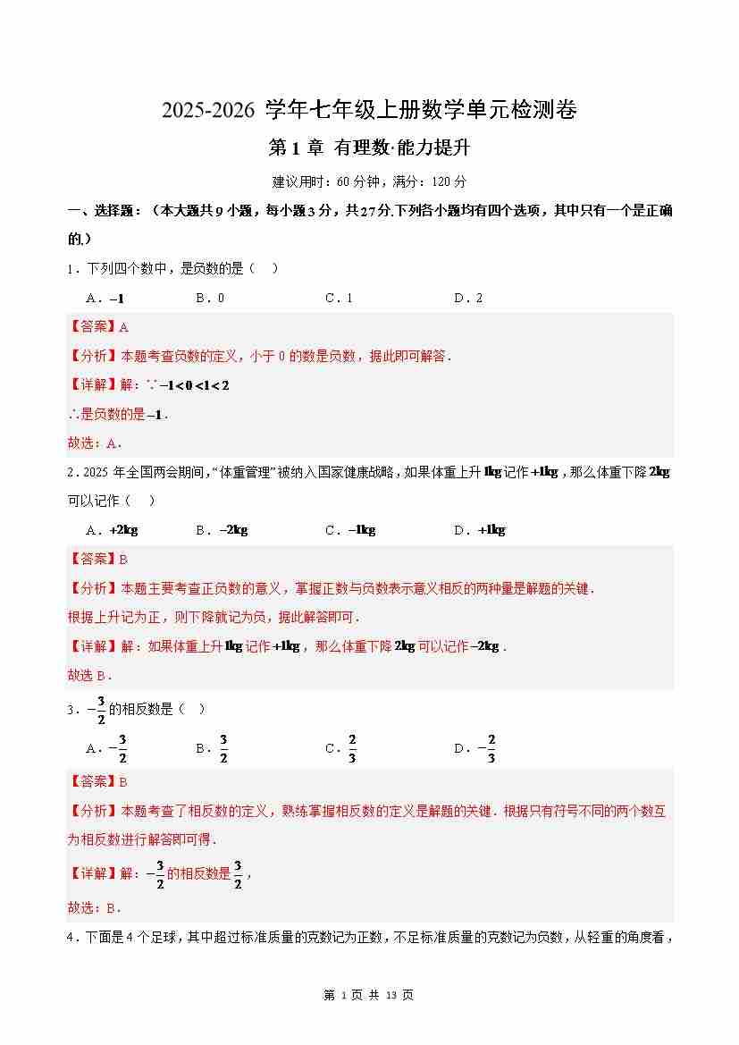 首页 > 全部 > 单元测试 > 七上数学第1章 有理数测试·提升卷(解析版)
