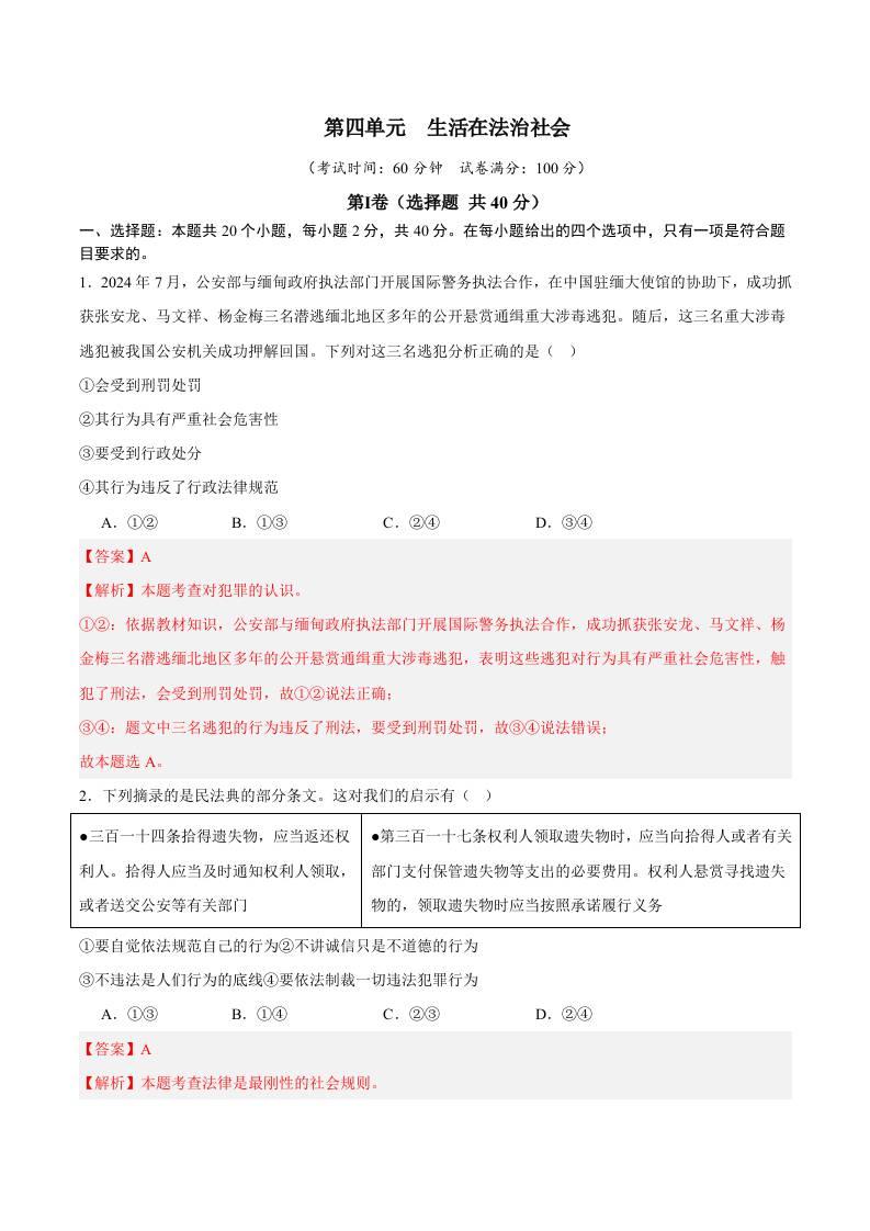 首页 > 全部 > 单元综合卷 > 4第四单元 生活在法治社会【A卷·提升卷】(解析版)