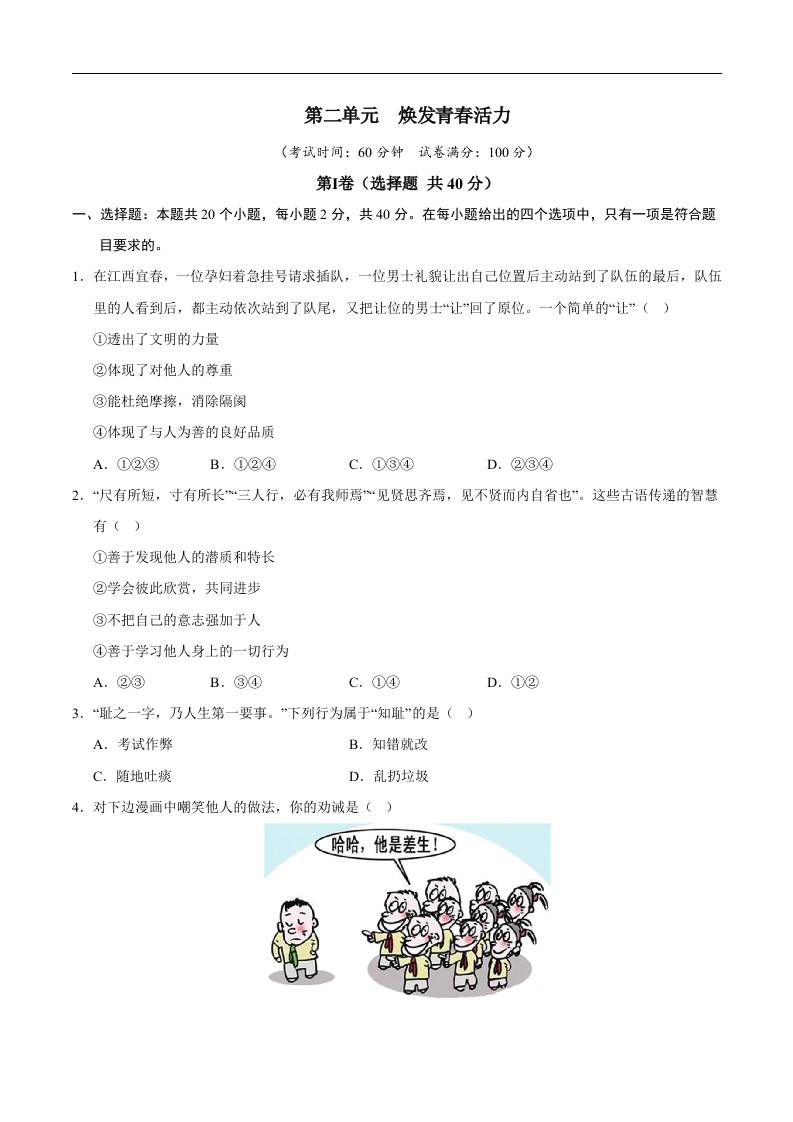 首页 > 全部 > 单元综合卷 > 2第二单元 焕发青春活力【A卷·提升卷】(学生版)-七年级道德与法治下册单元速记·巧练(全国通用,统编版2024)
