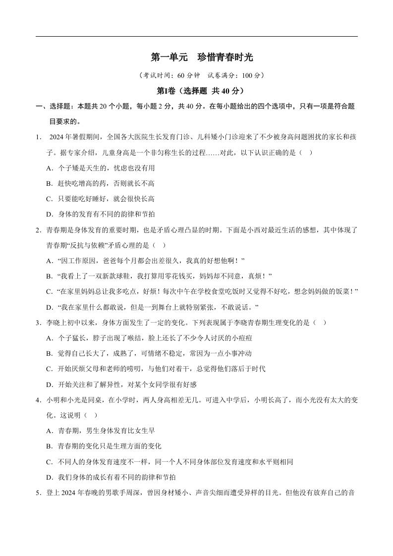 1第一单元 珍惜青春时光【B卷·培优卷】(学生版)-七年级道德与法治下册单元速记·巧练(全国通用,统编版2024)