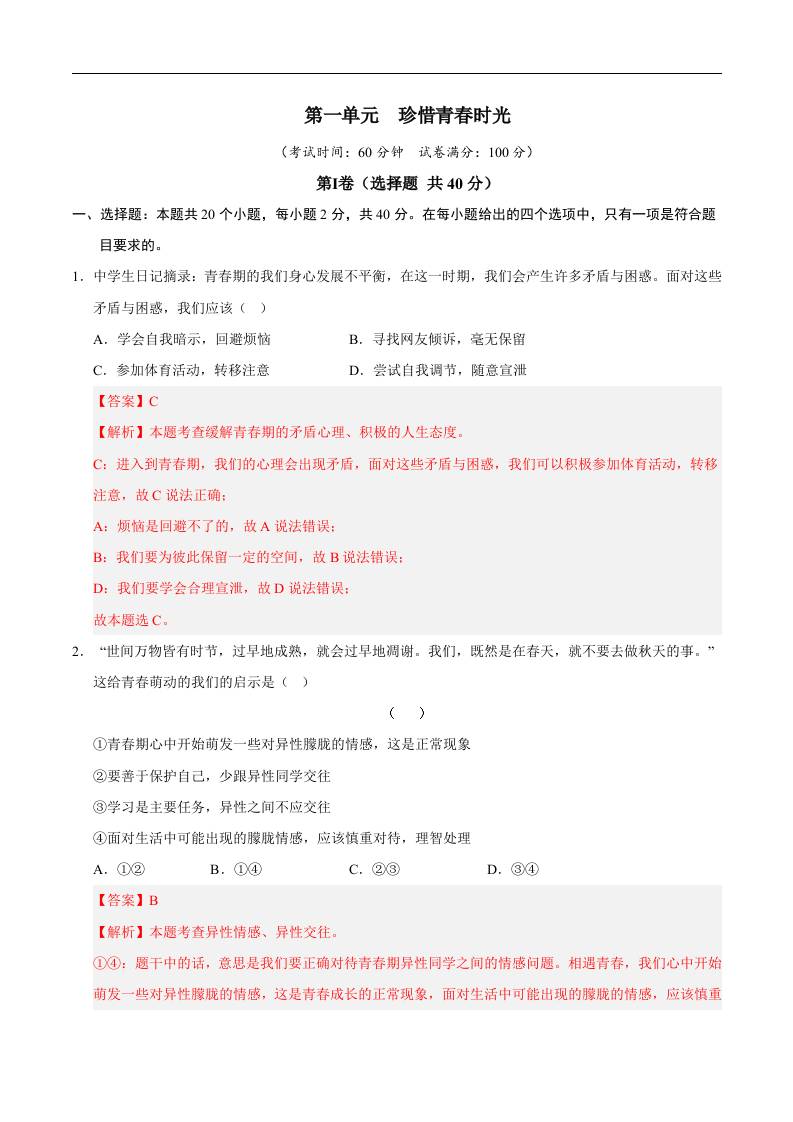 首页 > 全部 > 单元综合卷 > 1第一单元 珍惜青春时光【A卷·提升卷】(解析版)-七年级道德与法治下册单元速记·巧练(全国通用,统编版2024)
