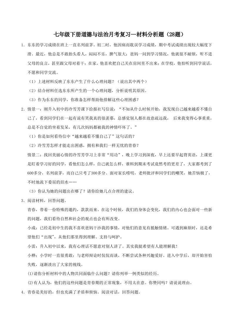 七年级道德与法治月考—材料分析题 专项训练(原卷版)