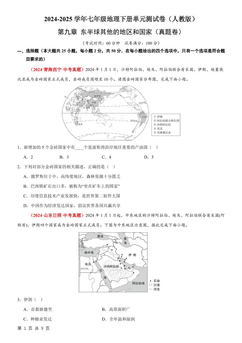 3第九章 东半球其他的地区和国家【B卷·真题卷】(原卷版)