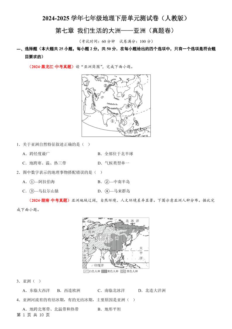 首页 > 全部 > 单元真题卷 > 1第七章 我们生活的大洲——亚洲【B卷·真题卷】-2024-2025学年七年级地理下册单元速记·巧练(人教版)(原卷版)