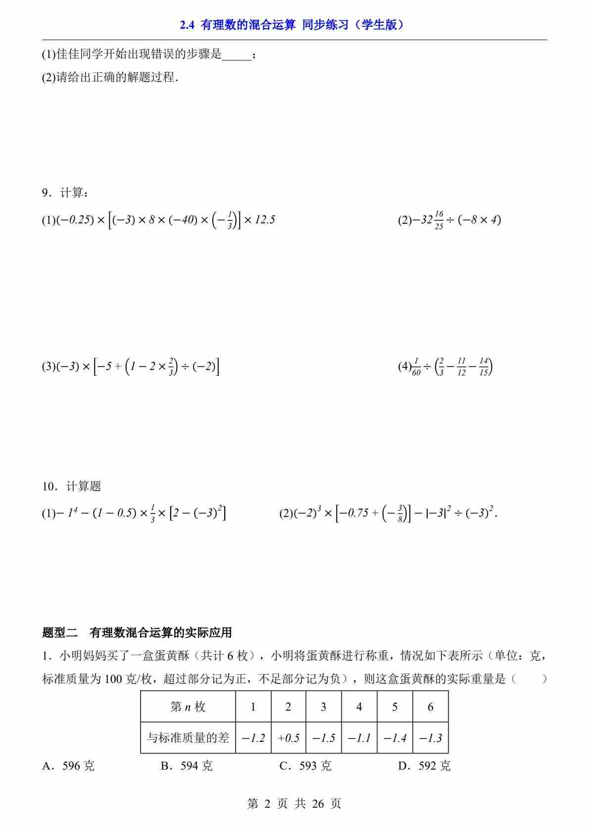 2.4 有理数的混合运算(分层练习)