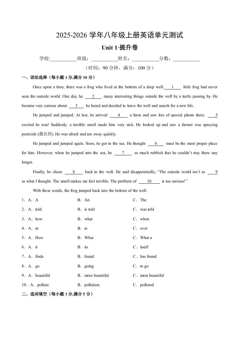 首页 > 全部 > 单元提升卷 > Unit 1 Water(单元测试·提升卷)(考试版A4)
