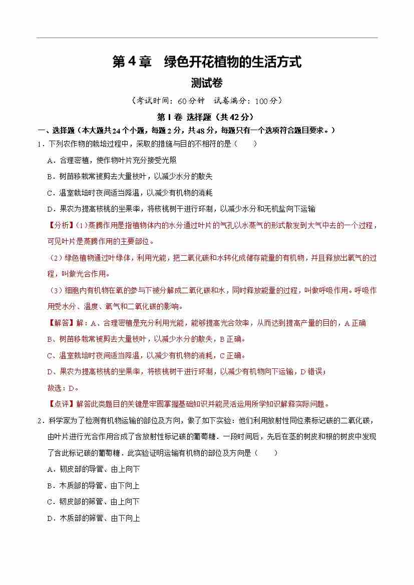 首页 > 全部 > 单元检测 > 第4章 绿色开花植物的生活方式【单元卷·测试卷】(解析版)-七年级上册生物(新北师大版)