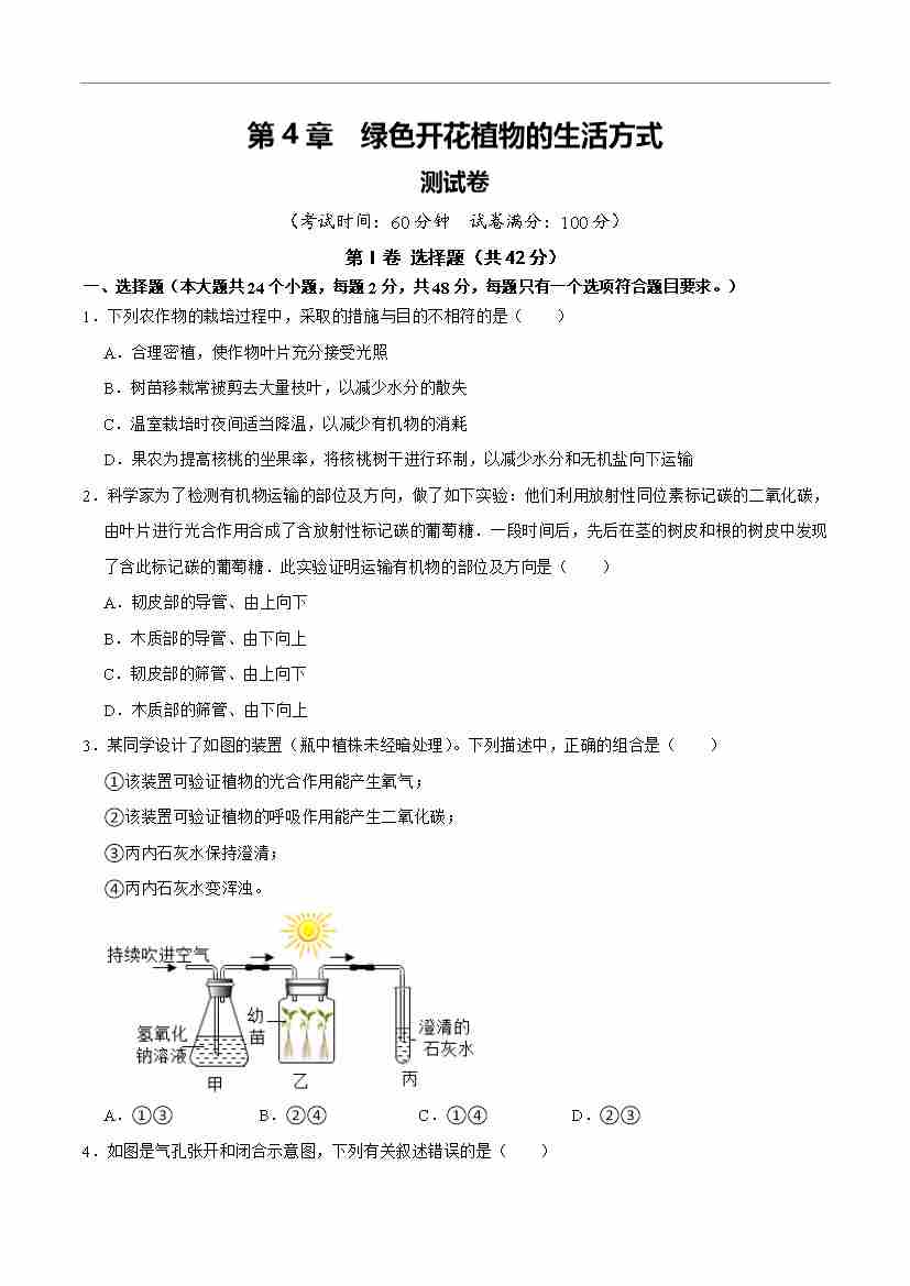 第4章 绿色开花植物的生活方式【单元卷·测试卷】(原卷版)-七年级上册生物(新北师大版)