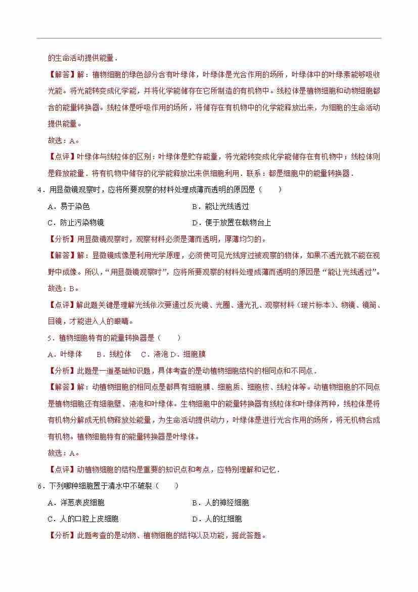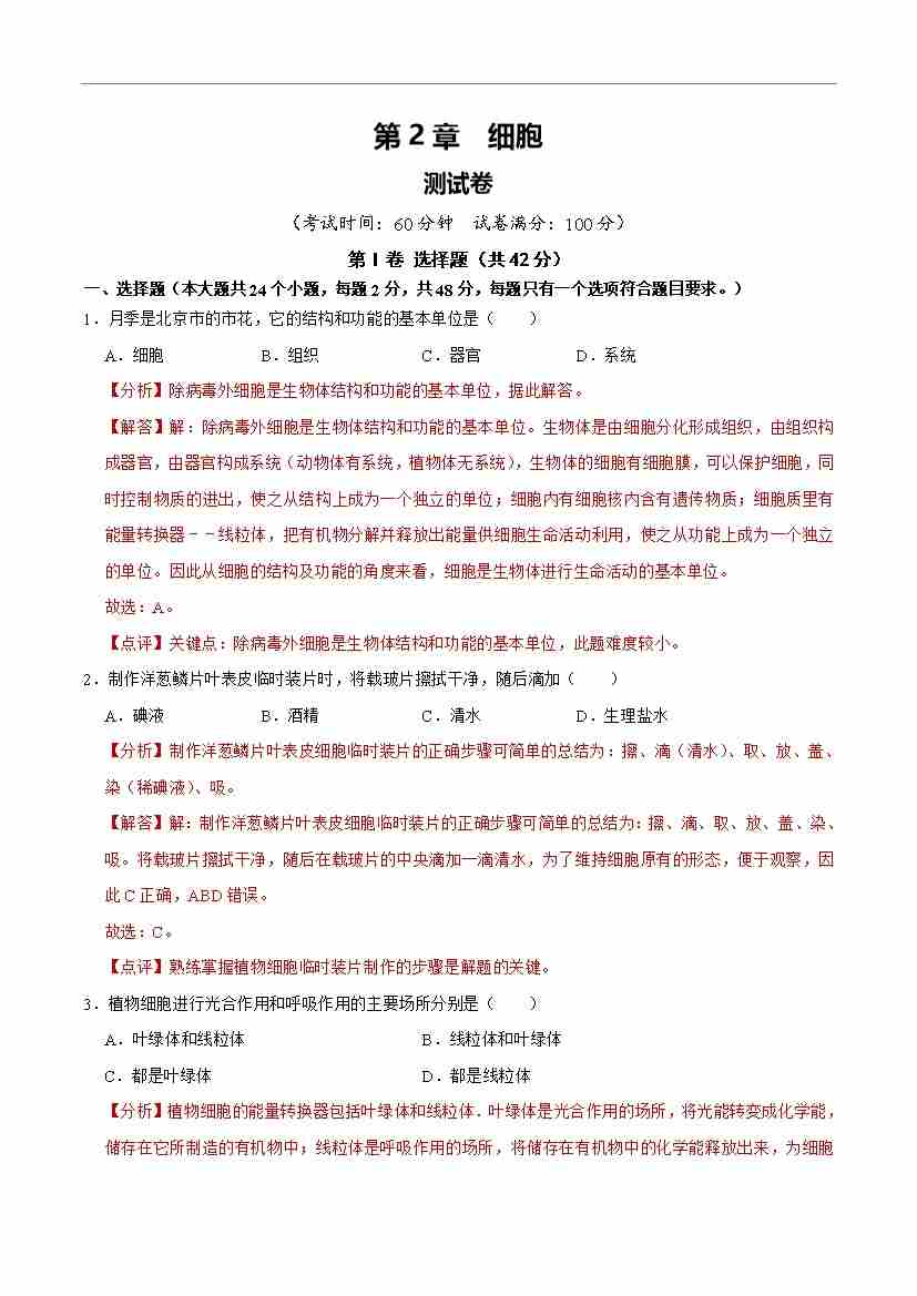 首页 > 全部 > 单元检测 > 第2章 细胞【单元卷·测试卷】(解析版)-七年级上册生物(新北师大版)