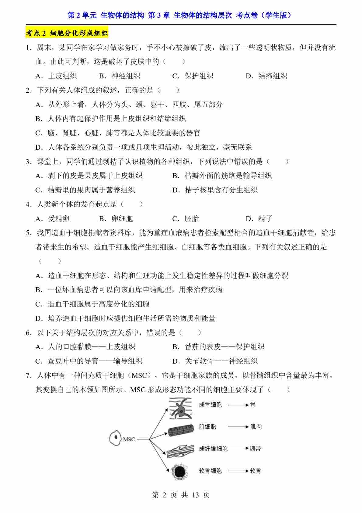 第2单元 第3章 生物体的结构层次(考点卷)