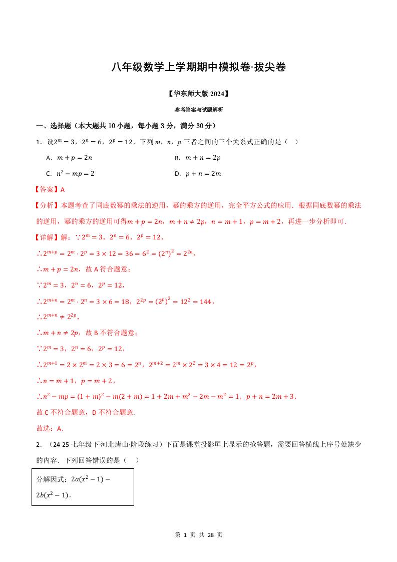 八年级数学上学期期中模拟卷·拔尖卷(华东师大版2024,举一反三)(解析版)