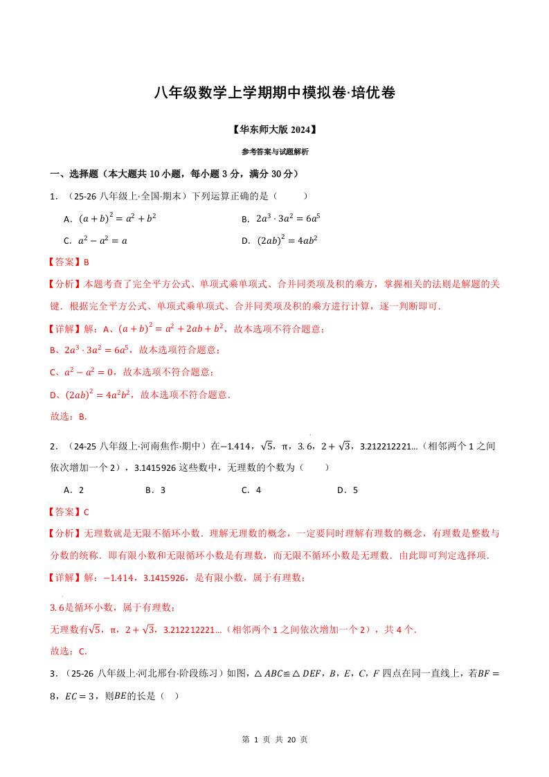 首页 > 全部 > 期中试卷 > 八年级数学上学期期中模拟卷·培优卷(华东师大版2024,举一反三)(解析版)