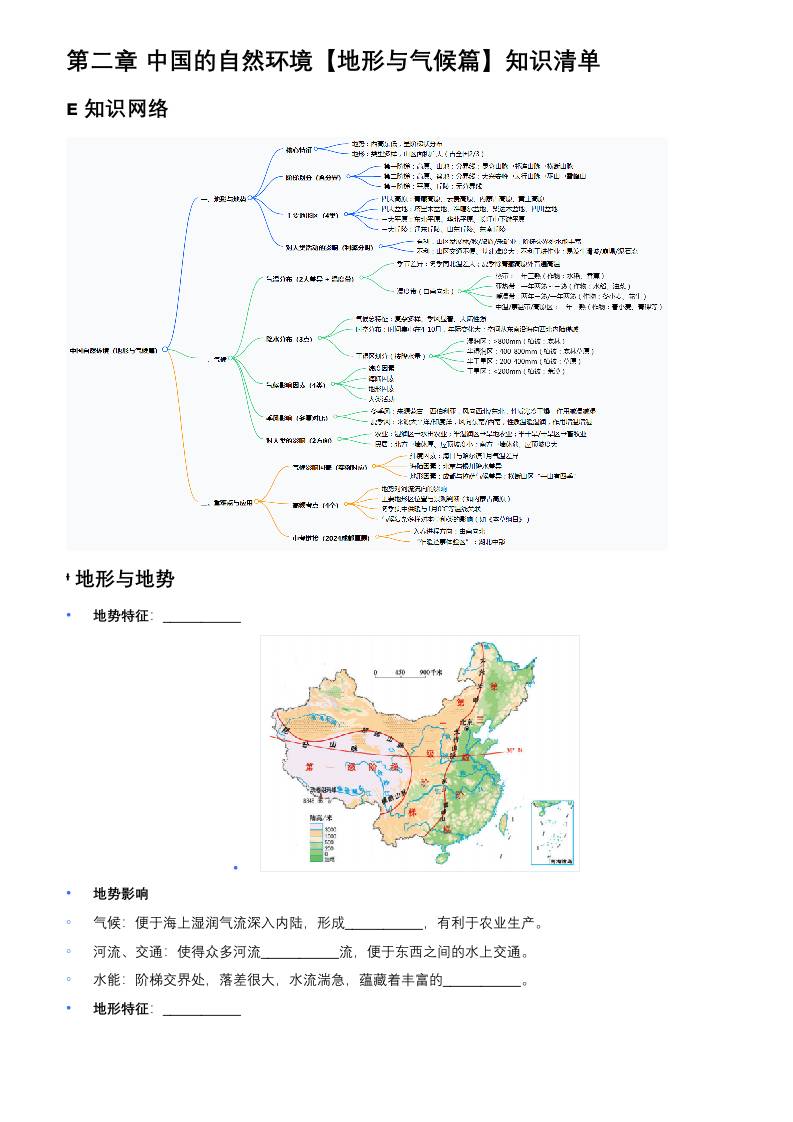 第三章 中国自然环境(地形与气候篇) (知识清单·下划线挖空版)