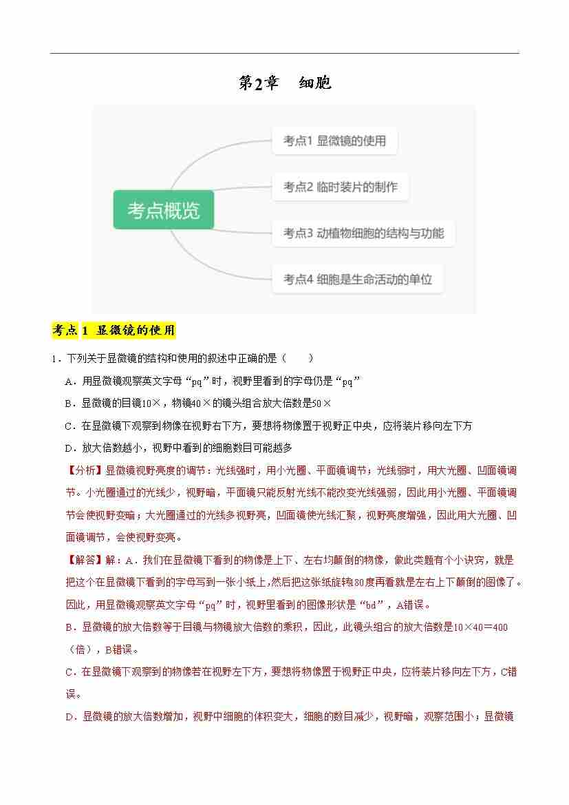 首页 > 全部 > 考点提升卷 > 第2章 细胞【单元卷·考点卷】(解析版)-七年级上册生物(新北师大版)