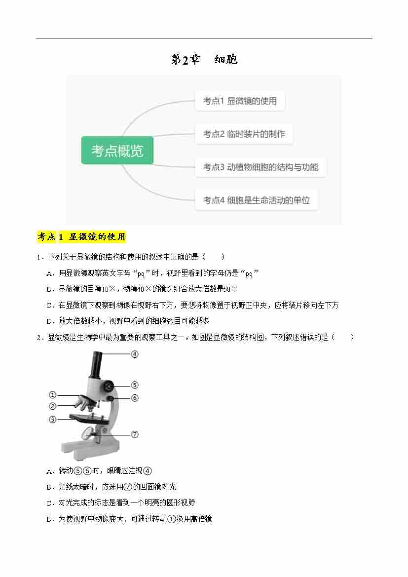 首页 > 全部 > 考点提升卷 > 第2章 细胞【单元卷·考点卷】(原卷版)-七年级上册生物(新北师大版)