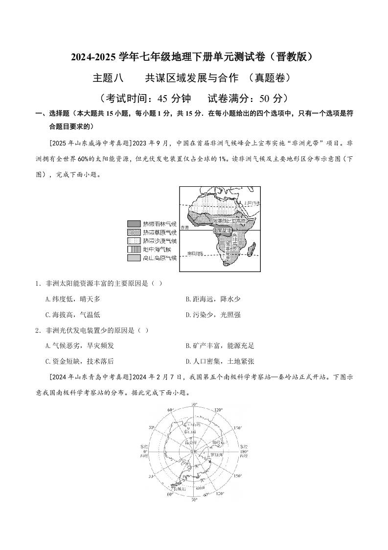 主题八 共谋区域发展与合作单元试题【B卷·真题卷】(原卷版)
