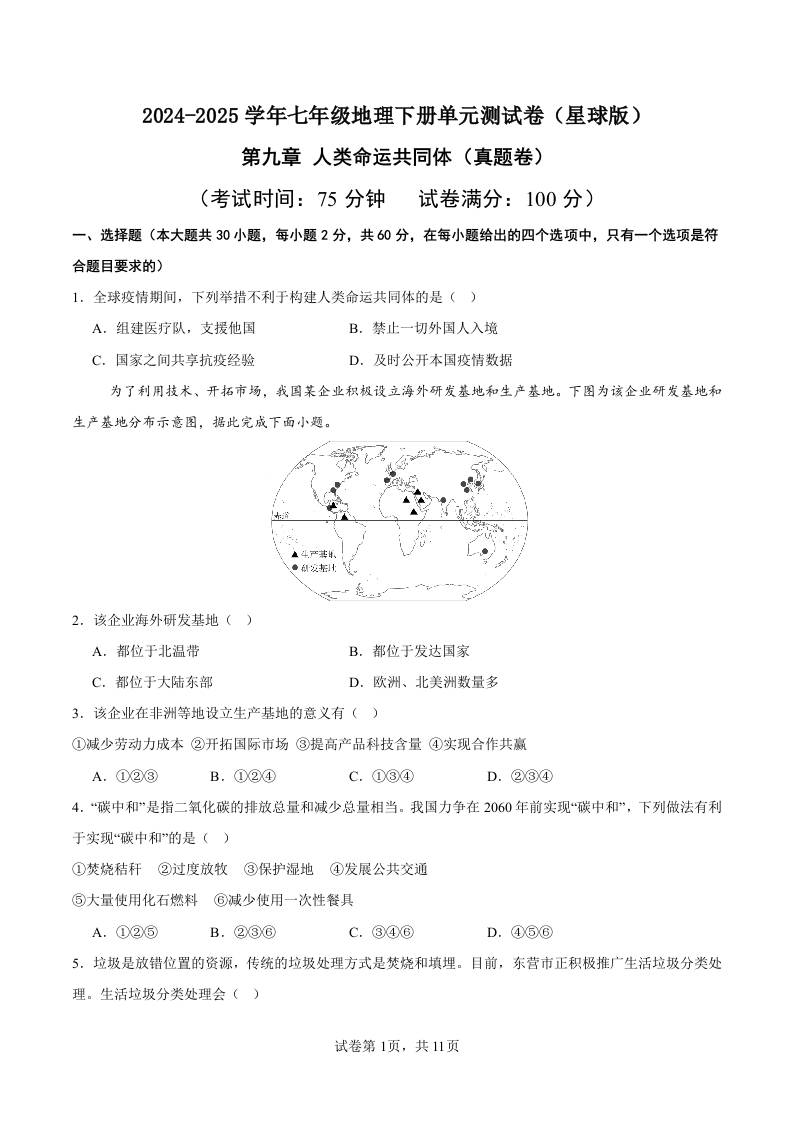 首页 > 全部 > 单元真题卷 > 第九章 人类命运共同体【B卷·真题卷】-2024-2025学年七年级地理下册单元速记·巧练(星球版)(原卷版)