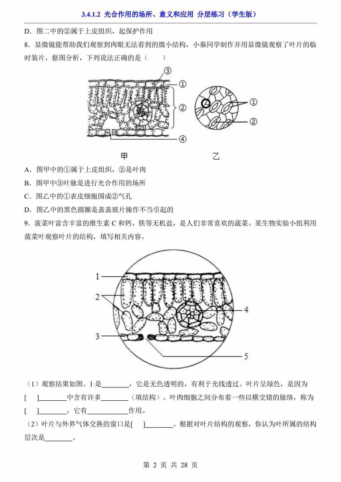 3.4.1.2 光合作用的场所、意义和应用(分层练习)