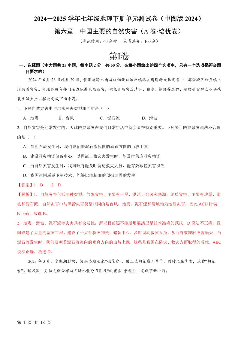 首页 > 全部 > 单元真题卷 > 第6章 中国主要的自然灾害【A卷·培优卷】-(解析版)