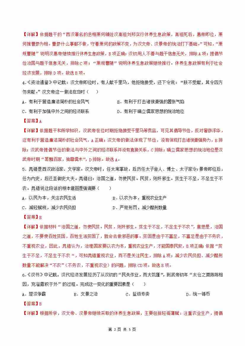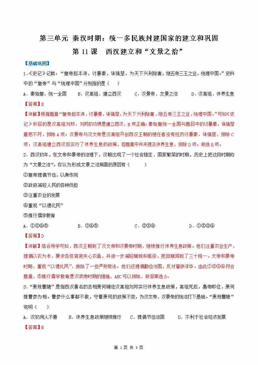 第11课 西汉建立和“文景之治”(分层作业)(解析版)