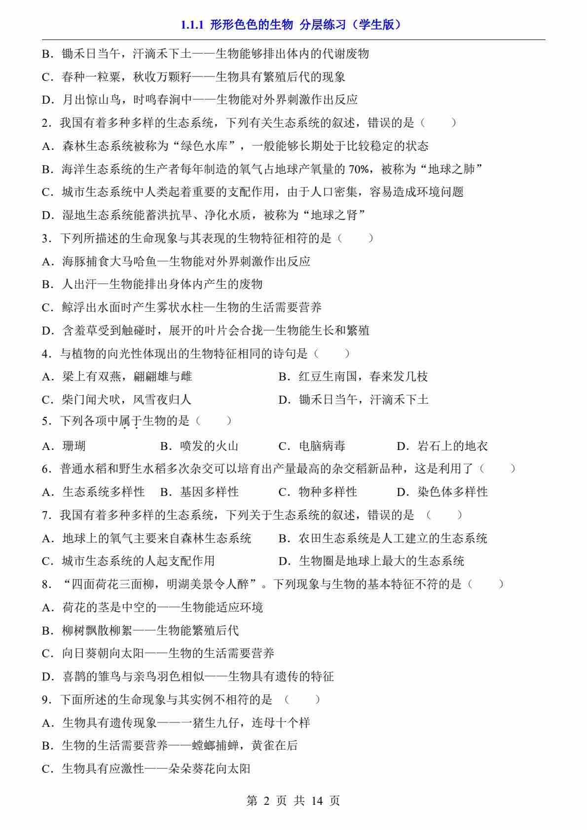 首页 > 全部 > 一课一练 > 1.1.1 形形色色的生物(分层练习)