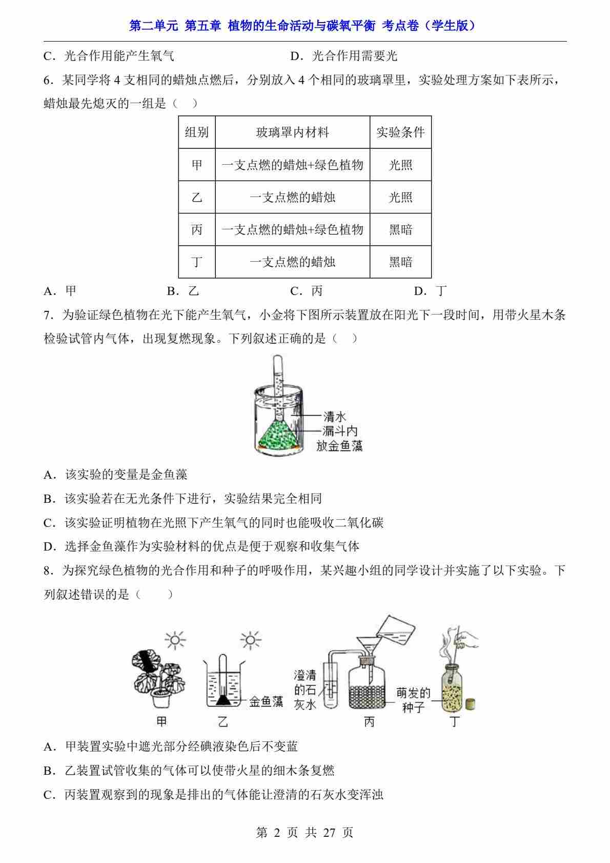 首页 > 全部 > 单元测试 > 第2单元 第5章 植物的生命活动与碳氧平衡(考点卷)