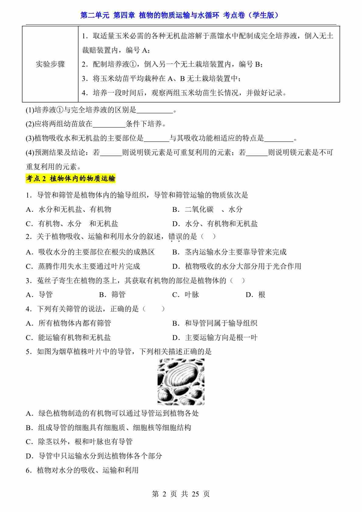 第2单元 第4章 植物的物质运输与水循环(考点卷)
